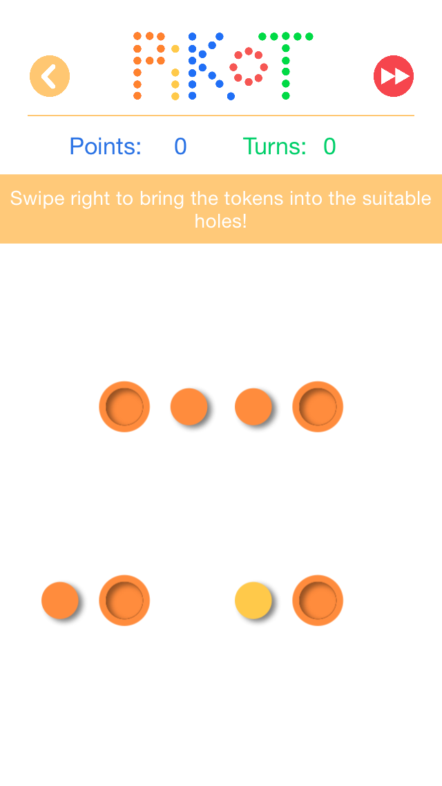 Tokens must be holed . Whether red, yellow, green or blue, do all the tokens into the suitable holes. But there come more tokens and more holes, so hold on as long as you can and get the highest score. Use the Game Center to challenge friends and unlock many achievements. We appreciate your feedback! --THE GAME-- You have to slide the tokens in the same colored holes. However, more colors, more stones and of course more points the longer you endure. You lost if the field is full and you no longer can move . For each holed token there is a point. --RULES-- > The initial four holes remain. > When you hole, the token will disappear and the colors of the holes change. > A new hole will appear when you didn't hole a token within 3 turns. > If you can hole 3 turns after another at least 1 token, one of the new holes will disappear. Here we go !